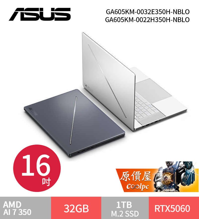 華碩 ROG Ryzen AI 7 350/RTX5060/32G/1T/16吋 鉑月銀 GA605KM-0022H350H-NBLO $69999>蝦皮商城>官網