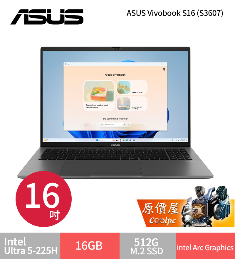 華碩 Vivobook Ultra 5-225H/16G/512G/16吋 夜幕灰 S3607CA-0122G225H 超值OLED $30999>蝦皮商城>官網