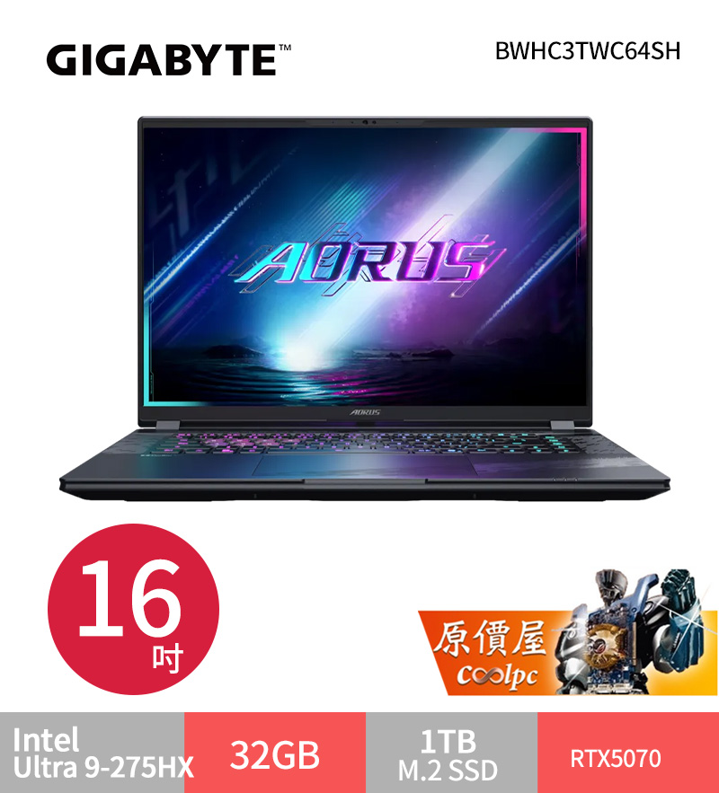 技嘉 AORUS ELITE 16 Ultra 9-275HX/RTX5070/32G/1T/16吋 黑 BWHC3TWC64SH $66900>蝦皮商城>官網