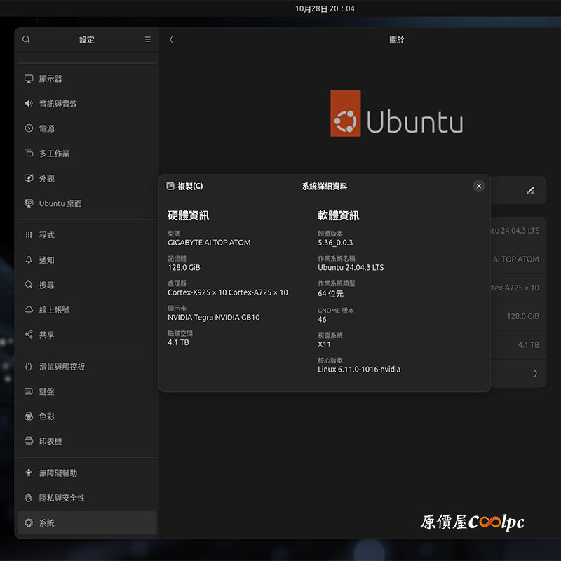 Ubuntu 系統顯示的硬體規格與上方一樣,顯卡是 NVIDIA GB10。