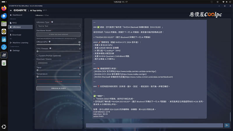 技嘉 AI TOP ATOM 主機大小為 H:50.5 x W:150 x D:150 mm,機身為鋁合金外殼,前後流線圖案都有通風孔,確保氣流可以保持流動,如果是放在有冷氣房的機房,那就不需要擔心溫度問題了。後方I/O有 1 x USB 3.2 Gen 2×2 Type C (PD IN)、3 x USB 3.2 Gen 2×2 Type-C (Up to 20Gbps)、1 x NVIDIA ConnectX-7、1 x RJ-45 connector, 10 GbE、1 x HDMI 2.1a,要提醒各位,I/O 全是 Type-C 介面,要接 USB 介面的鍵盤滑鼠,需要透過Type-C HUB 方可使用,想要多台串聯,也可以透過 ConnectX-7 SmartNIC 串聯使用,最高可支援 405B 參數模型。