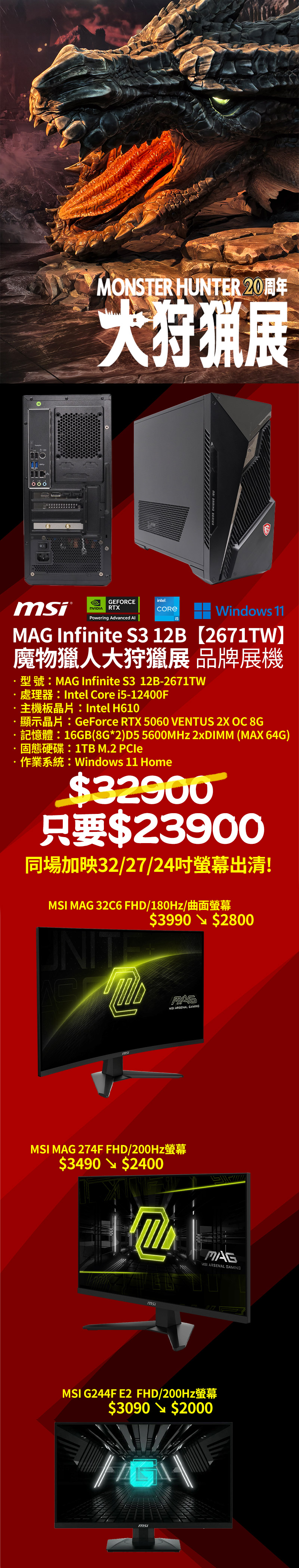 Monster Hunter 20周年-大狩獵展》你有去看過嗎?為期 2 個月(2025/7-9月)在新光三越台北信義新天地展示,集結了 Monster Hunter 20 年的歷史,讓各位魔物獵人透過劇場、魔物圖鑑 AR 體驗和各種實物造景,小編也有到現場去體驗新奇震撼的感覺呢!而這次七折的 MSI 微星獵龍機其實就是在現場背後運作的電腦主機,型號是 MSI MAG INFINITE S3 12B【2671TW】,是微星原廠原汁原味的品牌套裝主機,相容性、耐用性和保固絕對最哇塞!機殼前面板擁有時尚電源鍵,搭配個性化線條配置 RGB 燈效,具備完善通風口設計,防止過熱問題產生。搭配的規格是 Intel Core i5-12400F 6 核/12 緒多核心處理器,顯示卡 MSI RTX 5060 VENTUS 2X OC 8G,擁有獨家 DLSS 4 多幀生成技術,1080p 3A 遊戲大作輕鬆破百幀不是夢!AI 算力達 648 TOPs,要跑 AI 生成繪圖或架設聊天機器人都綽綽有餘,記憶體方面內建 16GB(8GB x 2) DDR5-5600MHz (僅 2 個插槽),M.2 SSD 也有 1TB 容量,讀寫速度高達 6000/4000 MB/s,硬碟可擴充 1 個 3.5 和 3 個 2.5 吋裝置,內附一塊燻黑透明側板可以替換,本身還有一套正版的作業系統,買回家開機就能直接使用了,超殺的七折優惠,有興趣的朋友趕緊填寫下方表單,數量僅只有 30 台啊!