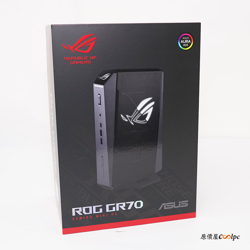 這台 ROG GR70 GAMING MINI PC 採用彩盒設計,正中間可以看到實機的示意圖,並且還有支援 ASUS AURA RGB 燈光軟體控制。