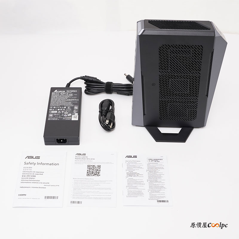 盒內配件包含 AC 變壓器、 ROG GR70 主機一台、安全性須知手冊、連結官網QR-Code 與產品保固資訊證書。
