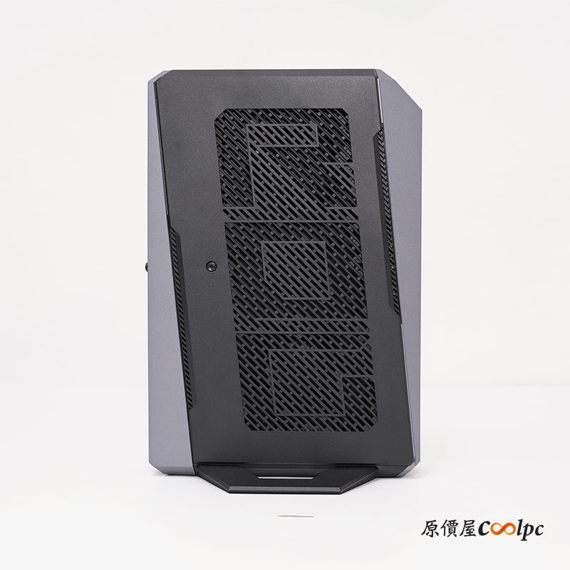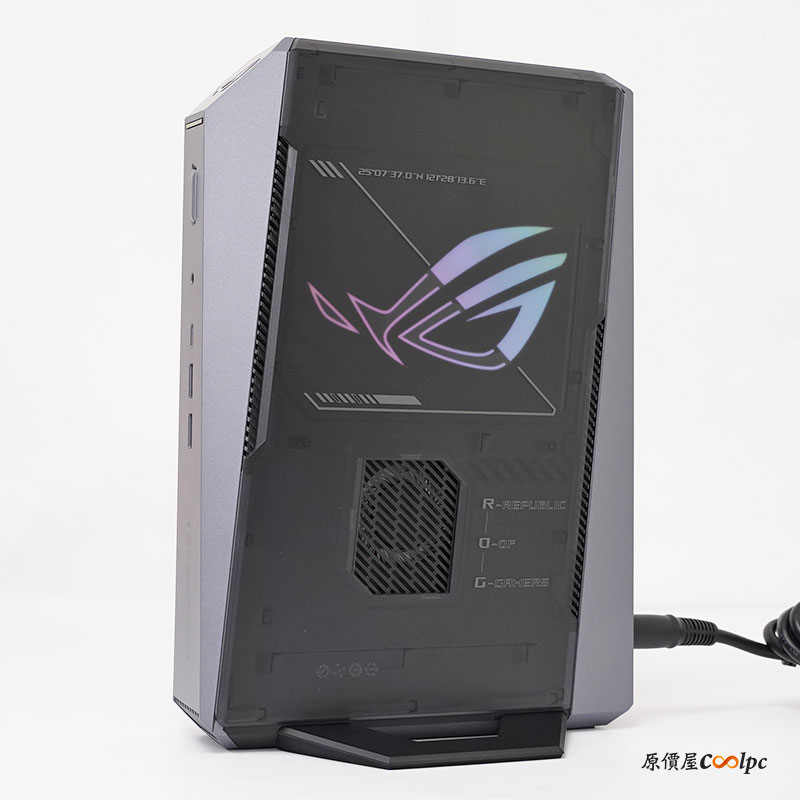 左右兩側除了通風孔之外,左邊是 ROG 字樣,右邊是燻黑透明遮光板,通電還會有 ARGB 燈光效果。