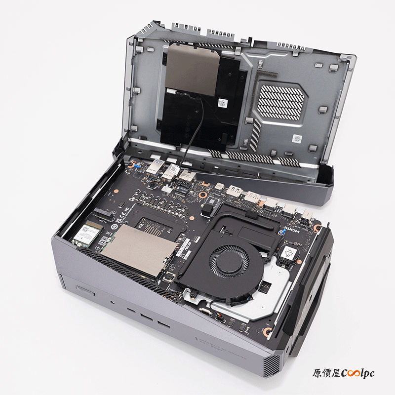 ROG GR70 主機外殼幾乎與先前的 ROG NUC 相同,唯有 LOGO 設計會有些許不同。體積大小為 282.44mm x 187.7mm x 56.6mm,重量約 2.75 公斤,兩側側板皆有進風開孔,出風口則是從後方的散熱鰭片散熱。前方 I/O 有 2 x USB3.2 Gen2(1A1C)、1 x 3.5mm Audio(Line out/Mic in/Headphone out)、開機按鈕、 LED 燈光;後方 I/O 則有 1 x USB 4 Type-C(支援 DP1.4,5V/3A,40Gbps)、1 x USB3.2 Gen2 Type-A、2 x HDMI 2.1、2 x DisplayPort 2.1、1 x 2.5GbE 網路埠、1 x Kensington Lock 、1 x DC-in 介面。這台機器影像輸出最多可支援五個畫面。
