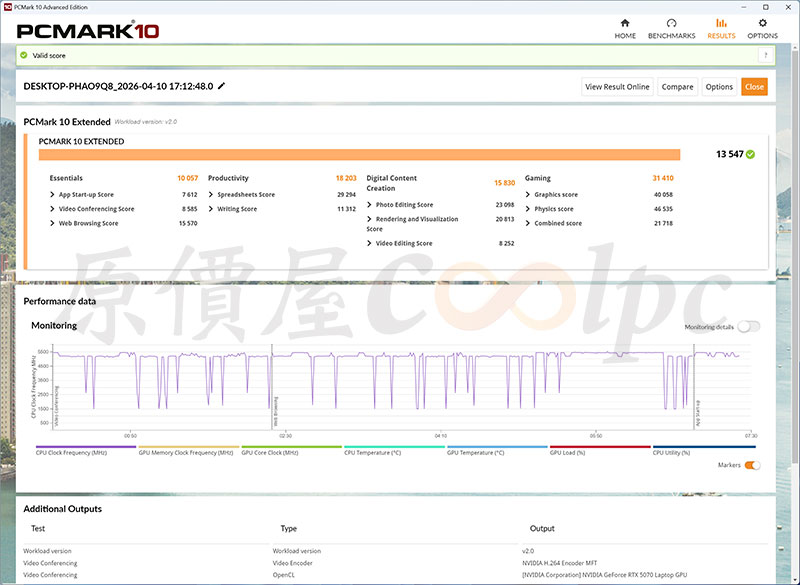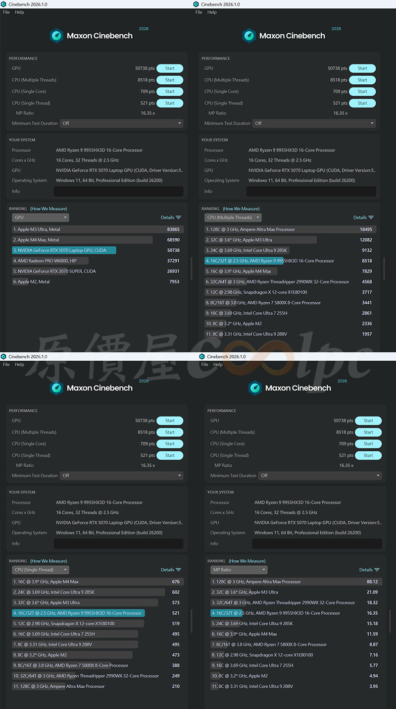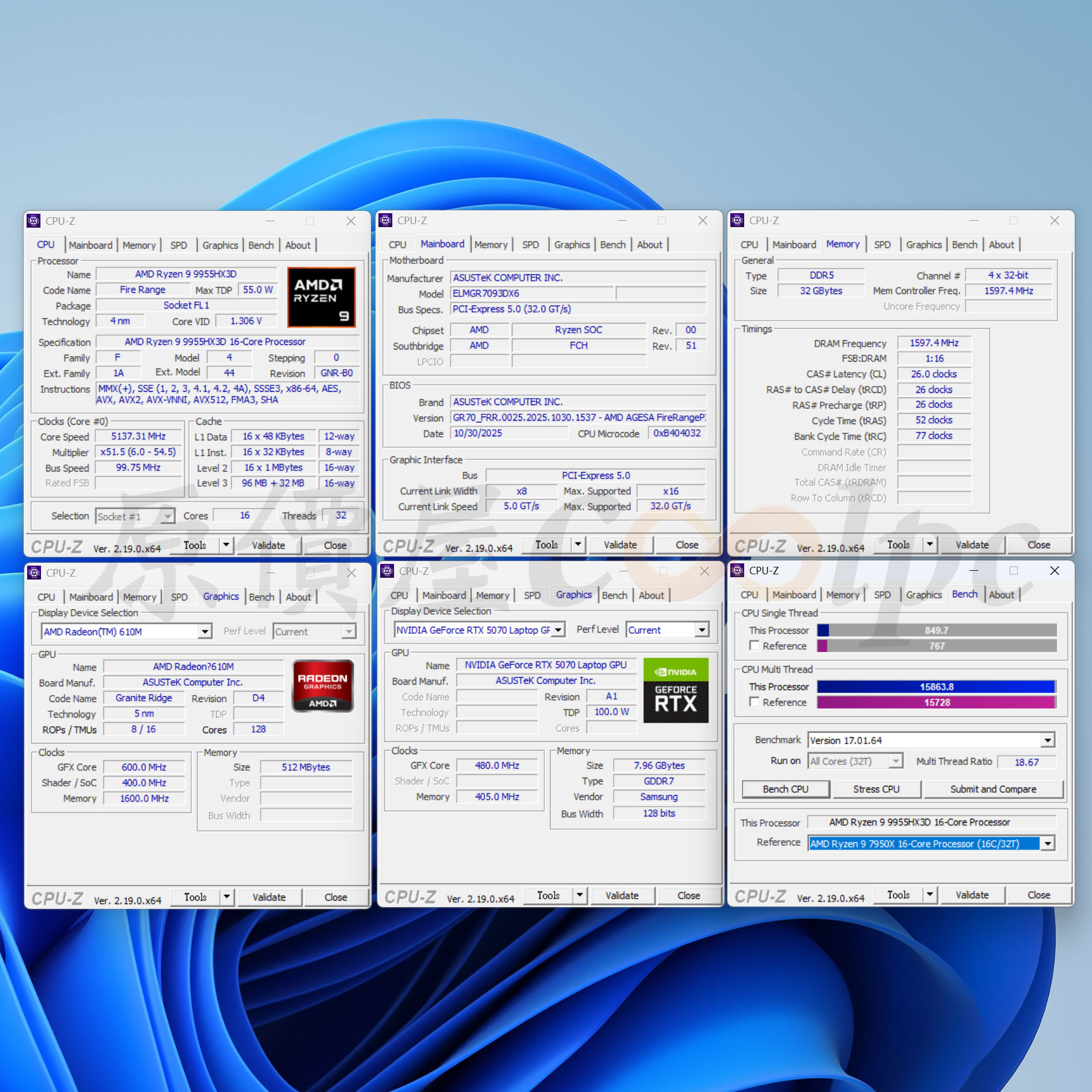 (點圖放大)透過 CPU-Z 驗證,處理器為 AMD Ryzen 9 9955HX3D 16核32緒,記憶體 DDR5 32GB容量,CPU 內顯為 AMD Radeon 610M、獨立顯卡為 NVIDIA GeForce RTX 5070 Laptop 8GB。AMD Ryzen 9 9955HX3D 這顆 CPU 效能媲美桌上型電腦 R9 7950X。