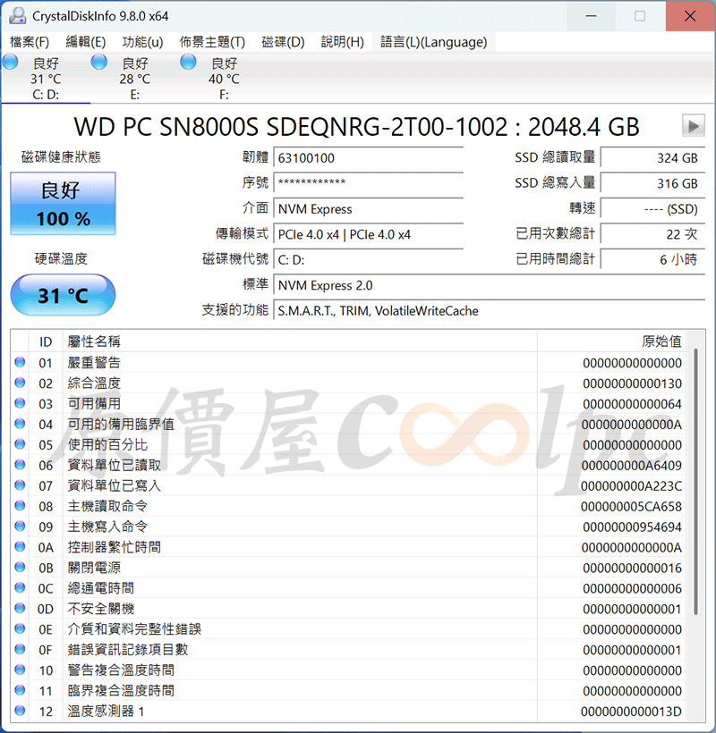 CrystalDiskinfo 9.8.0 x64 軟體偵測硬碟為 WD PC SN8000S 2TB Gen4 M.2 SSD,出廠有分割成 C 跟 D 兩個槽,支援 S.M.A.R.T、TRIM、VolatileWriteCache 功能,溫度的部分待機 31 度,滿載 44 度。多了一顆鼓風扇幫忙散熱溫度壓制不錯。