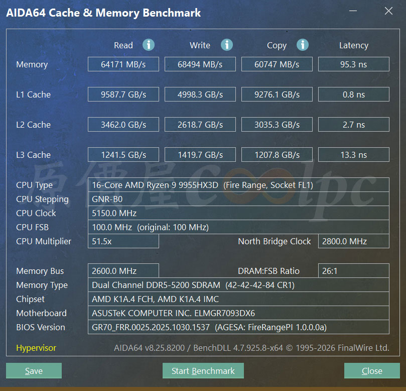 AIDA64 Cache & Memory Benchmark 測試結果。