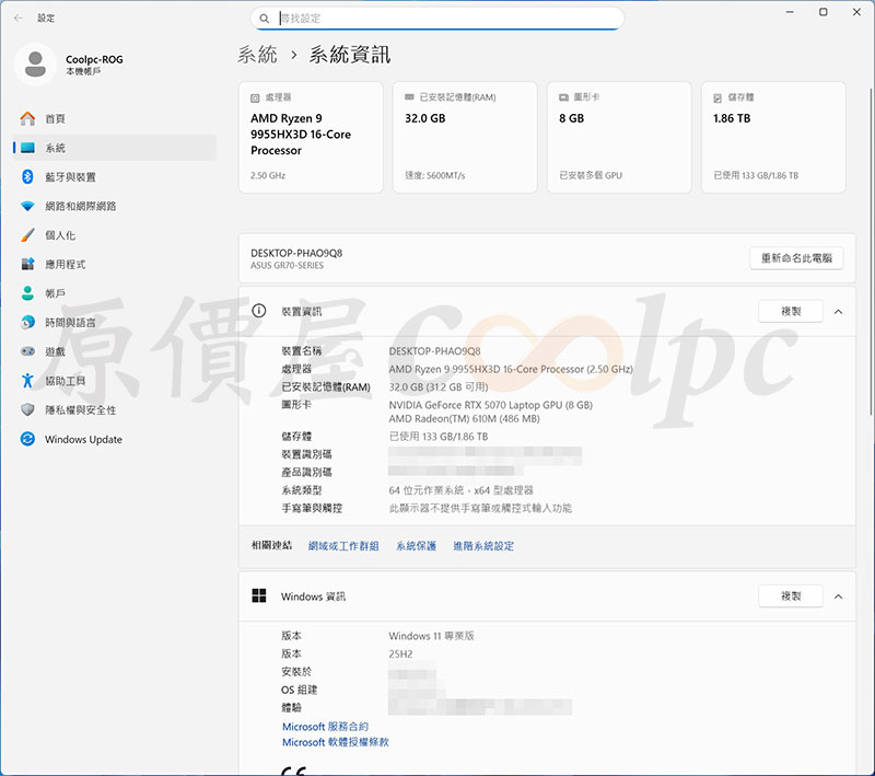 作業系統搭載 Windows 11 專業版 25H2 版本。
