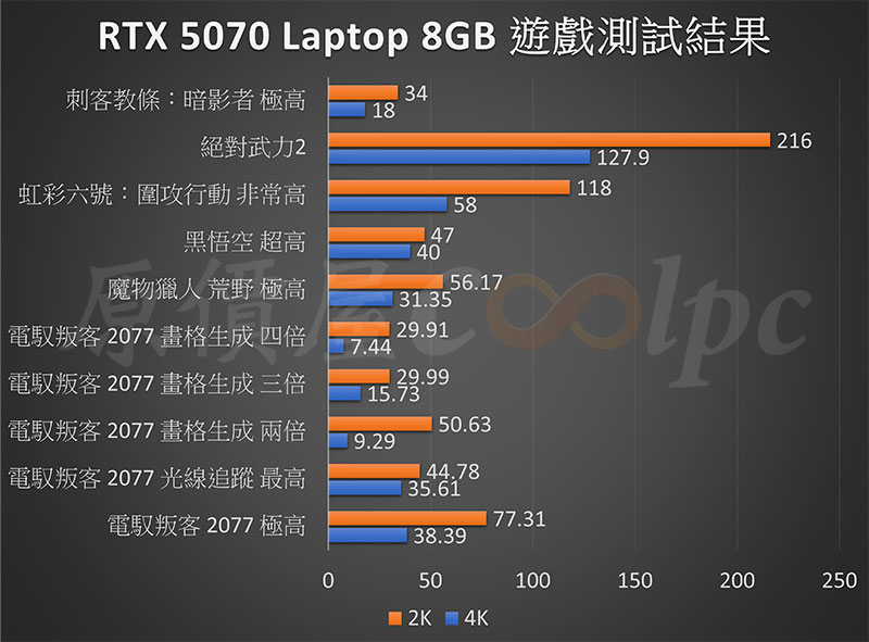 NVIDIA GeForce RTX 5070 Laptop 8G 跑 2K/4K 解析度除了射擊遊戲能夠穩穩百幀之外,其他的 3A 大作必須降點特效才能達到 60 幀的水準。