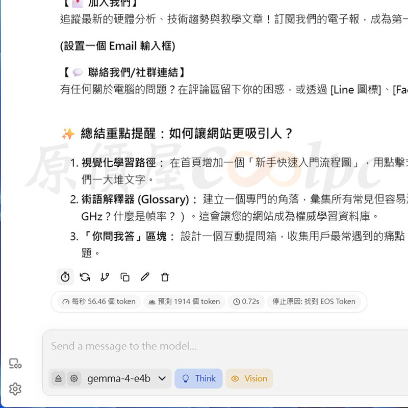 8G 的顯示記憶體也可以跑 gemma-4-e4b 的 LLM,速度還有每秒 56.46個 token。
