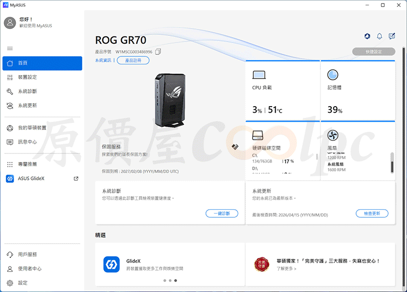 內建 MyASUS 軟體,如果電腦覺得怪怪的,可以透過它幫你檢測硬體有沒有問題。