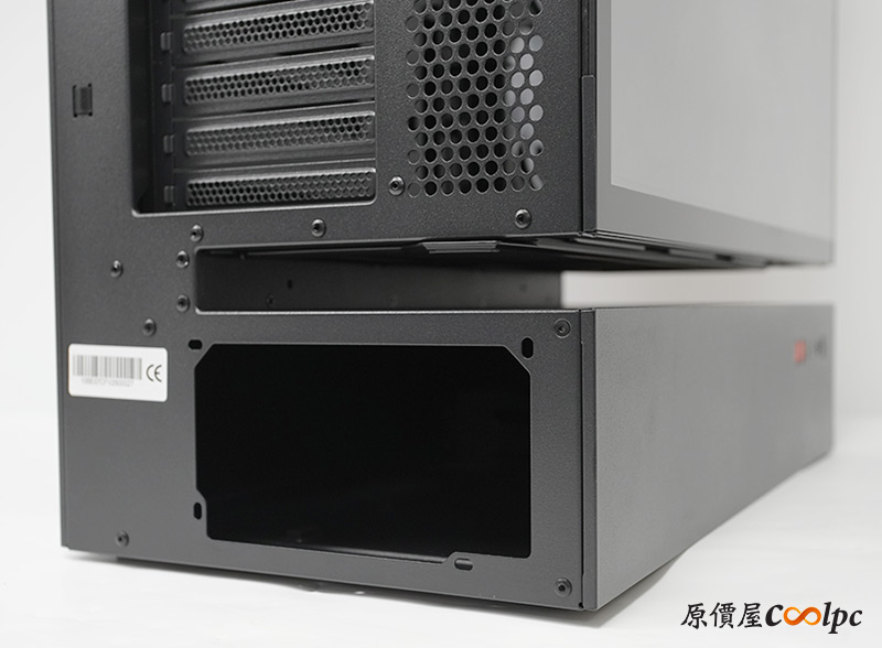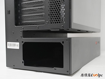 後方空間用於安裝硬碟與藏匿線材,底部的電源艙除了安裝電源供應器外,還有附上一個2.5″/3.5″複合式硬碟支架。