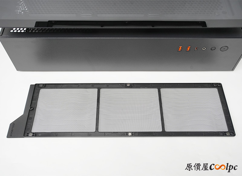 前風扇內側多一層濾網防塵,磁吸式的門可以直接打開,裡面看到風扇型號是COUGAR DGR160-W。