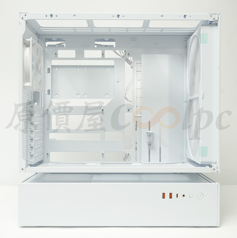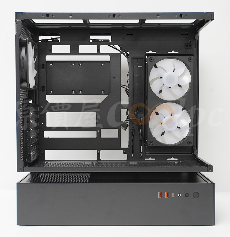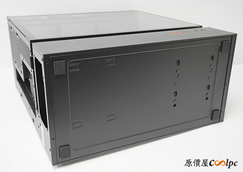 內部支援CEB、ATX、M-ATX、Mini-ITX規格主機板,也有背插式ATX、M-ATX主機板的開孔設計,整體空間寬敞無遮蔽,空氣流動通暢無阻,電源也有獨立分艙隔開,看上去規劃非常有條理。