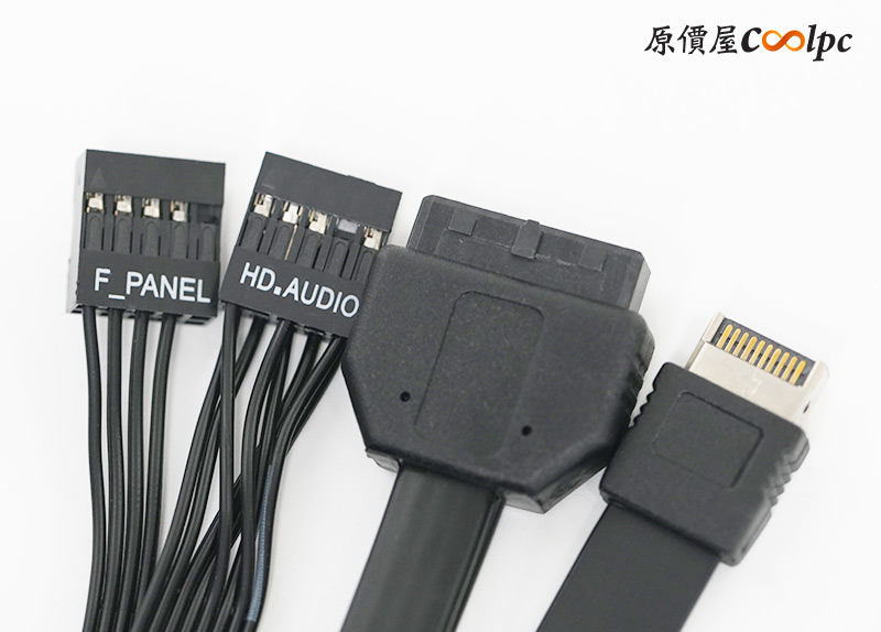 機殼跳線整合成一條F_PANEL,四極耳機音源孔對應到一條HD AUDIO,USB3.2 Gen2x2 Type-C & USB3.2 Gen1 Type-A則是對應USB 20Pin & USB 19Pin。