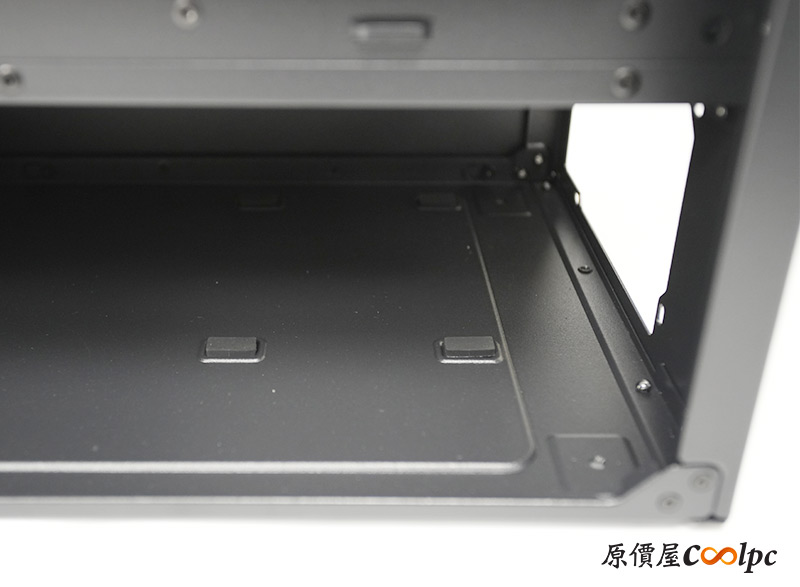 底部沒有電源供應器的散熱孔,因為CFV235特別讓電源安裝方向上下顛倒,改由透過漂浮設計的空間散熱。靠近前方是硬碟架固定處,看來僅有固定位置無法移動。