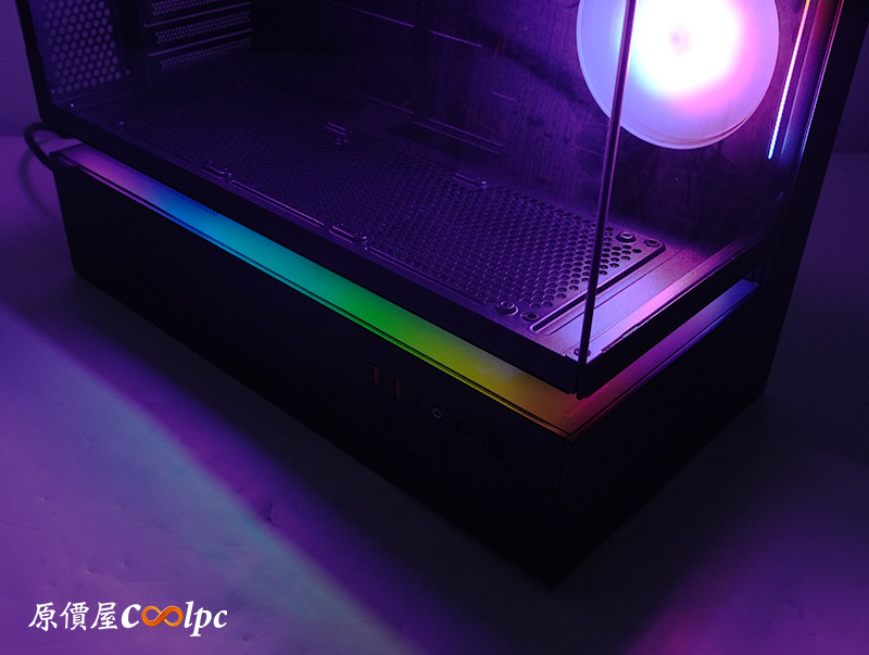 開燈啦!COUGAR CFV235本身有側2後1 ARGB風扇,其中可以看到側邊UNITY 240 ARGB PWM風扇的側流線,算是一個很好的效果點綴,小編個人是挺喜歡的。接著在懸浮間隔中裝上內附的LED燈條,底部早有設計好一個L型凹槽,讓LED燈條可以輕鬆放進去,另外也把磁吸底板放進去,如此就能強化LED燈條的間接照明效果,在暗室內就有一種裝上超巨大燈條的感覺一樣。而且燈光效果能夠直接透過I/O上的LED鍵控制,或者是透過主機板燈光軟體校調喔。