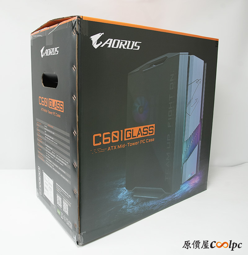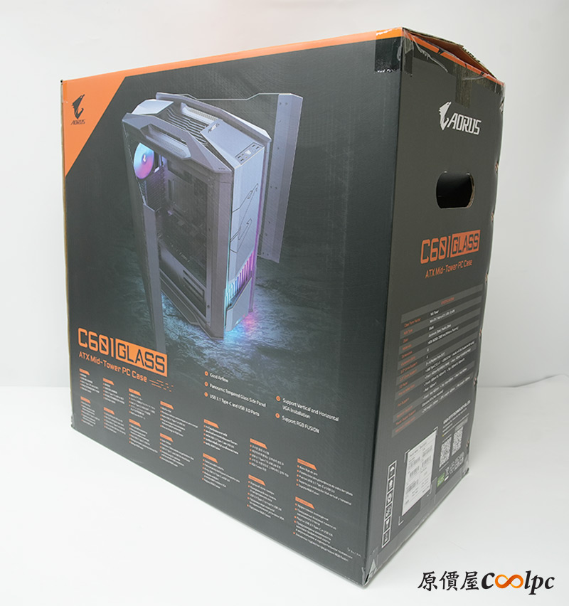 技嘉AORUS招牌橘黑配色包裝,上面印了機殼彩圖與型號「C601 GLASS」,側邊有簡易的規格表,後方則是多國語言版本機殼特色,還附上一張雙面玻璃敞開的帥照。