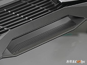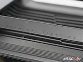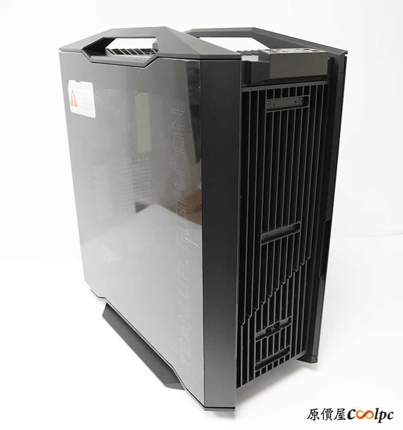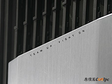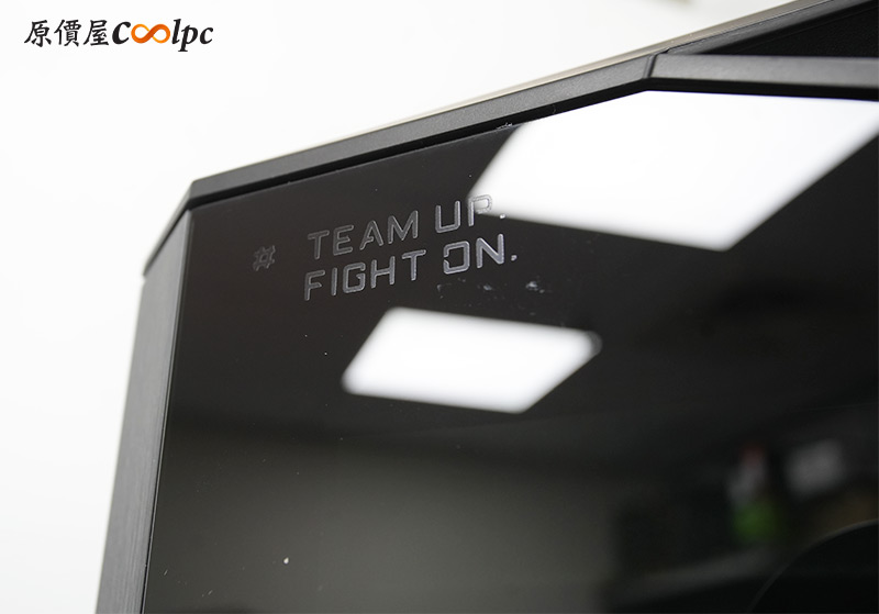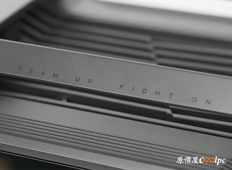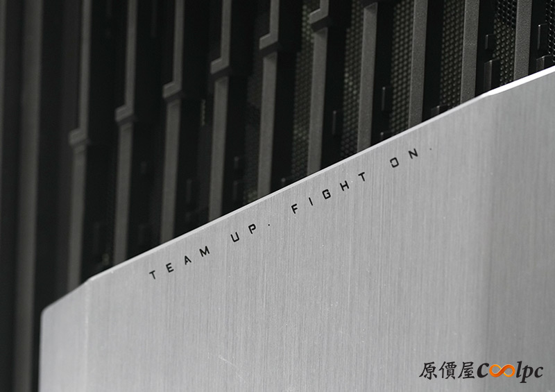 頂部也是很有設計感的地方,同樣有鋁拉絲風格的飾板,兩支提把內部是堅固的鋼材質,上面還有「TEAM UP. FIGHT ON.」字樣,另外也安排透氣孔輔助機殼散熱。
