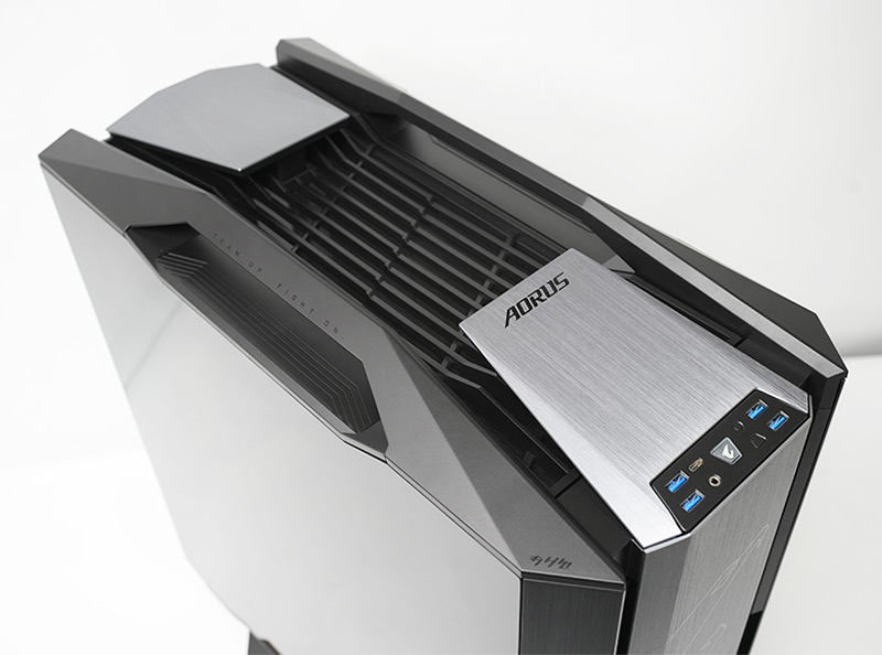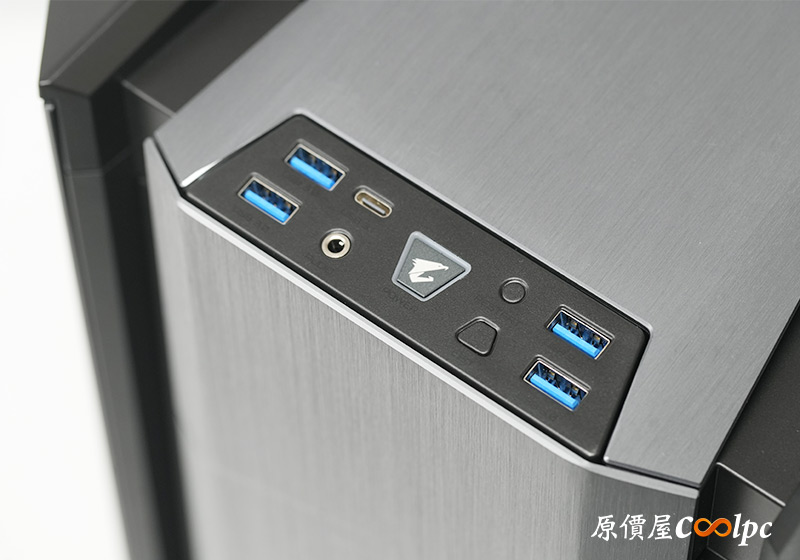 頂部I/O提供1x USB3.2 Gen2 Type-C、4x USB3.2 Gen1 Type-A、1x LED鍵 、1x POWER鍵、1x RESET鍵、1x 音訊孔,開機鍵還有AORUS標誌。