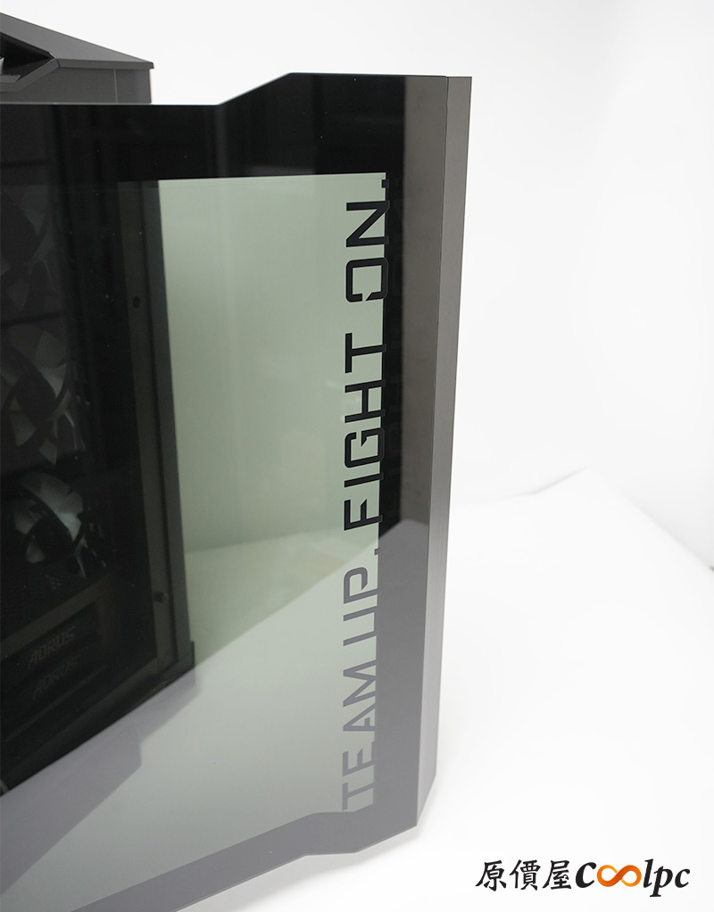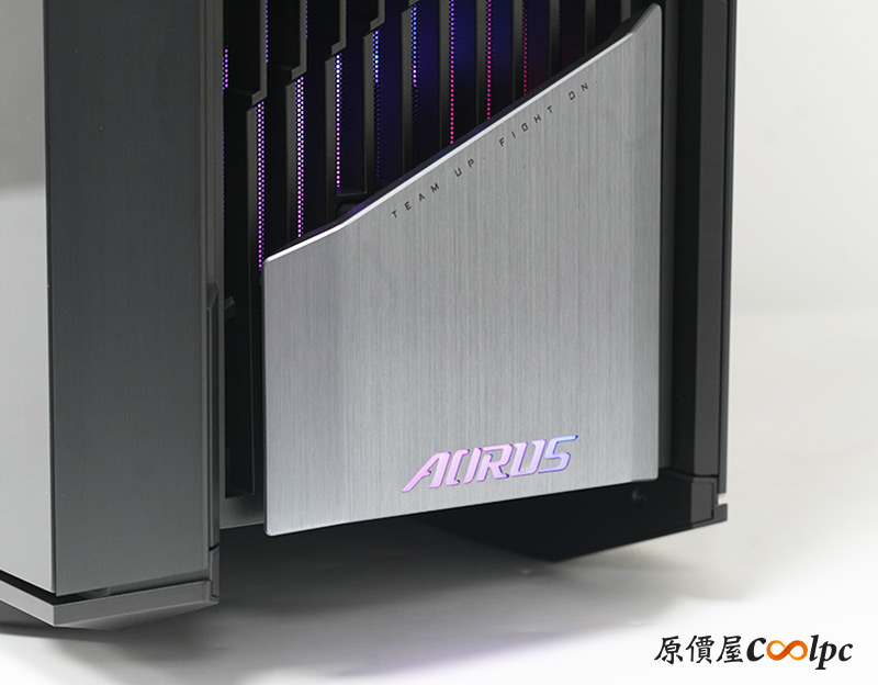 右側玻璃上則是縮小版的「TEAM UP. FIGHT ON.」字樣,還有註記AORUS DESIGNLAB設計。