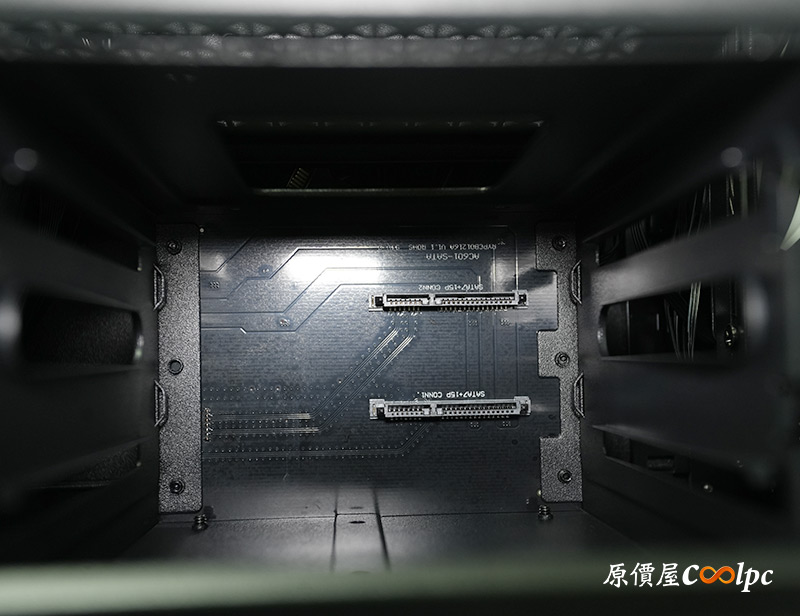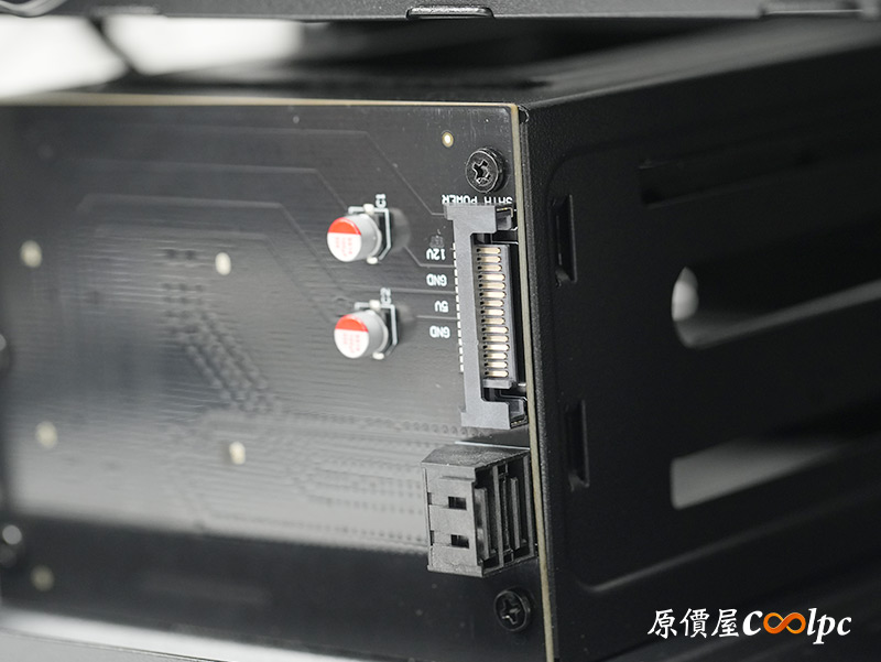 來到硬碟架的反面有SATA電源與SATA排線連接埠,連接方式相當特別,不過相比常見的安裝方式,可以很大程度避免SATA排線彎折,這點還挺不錯的。