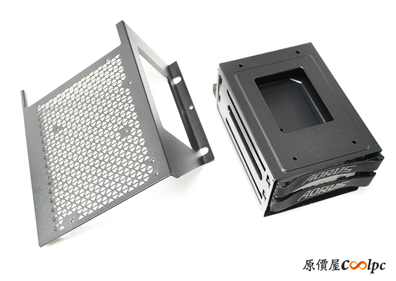 箱中會找到一盒配件,裡面有帥氣的AORUS裝甲,另外還有螺絲盒、USB 19Pin轉接線、複合硬碟架、魔鬼氈束帶、說明書。