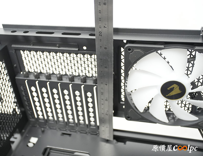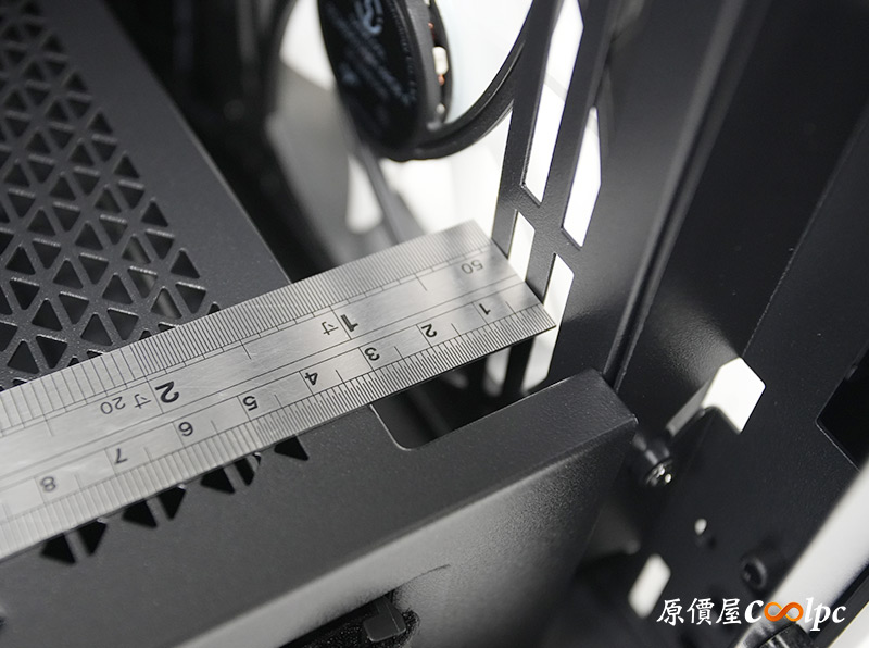 頂部明顯有挑高設計,最多可以裝3顆140mm或3顆120mm風扇,或是加裝420mm水冷散熱器,距離主機板也保留了將近70mm的距離,一定程度避免冷排與主機板上的元件衝突。