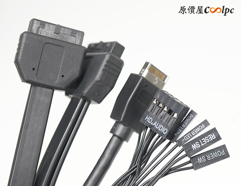 機殼線材的部分,因為USB3.2 Gen1 Type-A有4個,所以USB 19Pin跟著變成兩條,USB3.2 Gen2 Type-C則對照到USB 20Pin,音源孔需要一條HD AUDIO,剩下則是POWER SW、RESET SW、POWER LED±。
