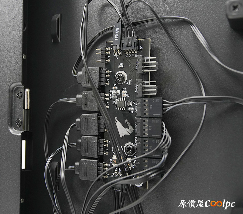 內附一個ARGB & PWM控制器,扣掉四顆ARGB風扇與前面板發光AORUS字樣後,還會有一個3 Pin 5V RGB和兩個小4Pin插槽可以使用。另外可以看到一條LED SW的線材連接,後續透過I/O上的LED鍵就能直接控制燈光。