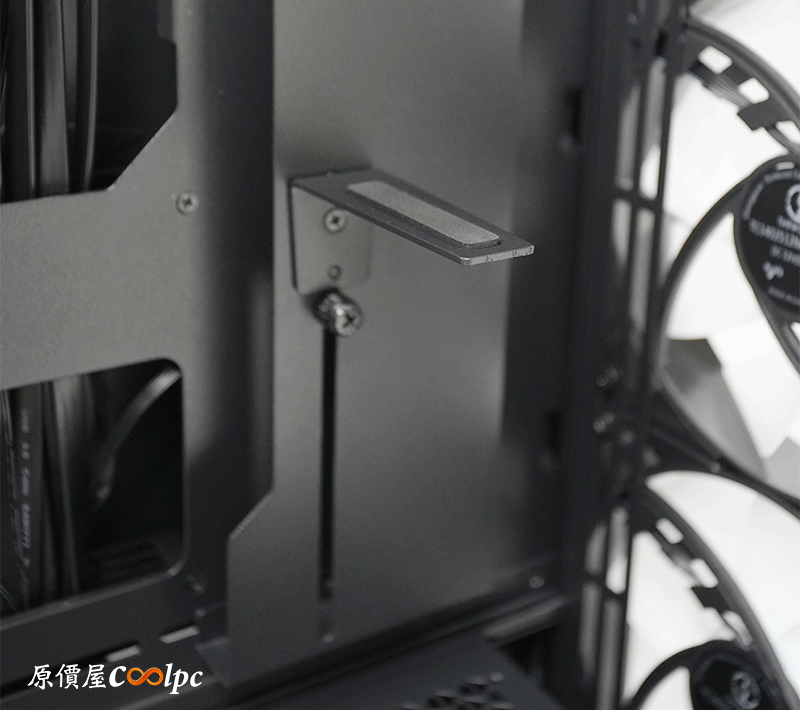 理線板上提供簡易的顯卡支撐設計,高低位置可用手轉螺絲調整,再搭配理線板移動範圍,就能夠做到更靈活的支撐效果了。