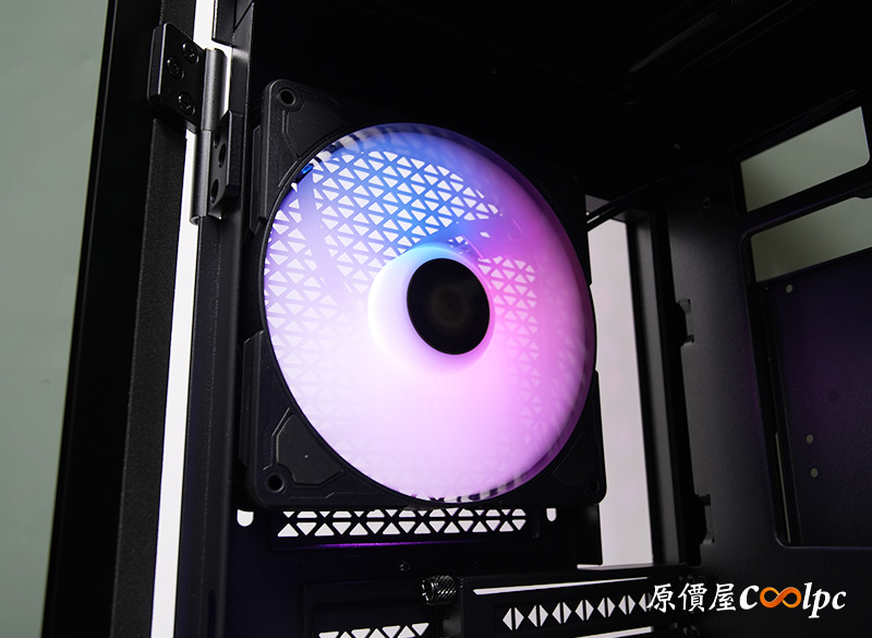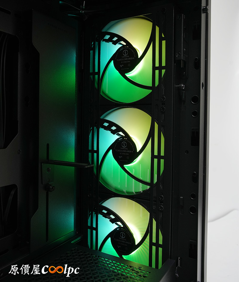 前方內建三顆140mm ARGB風扇,型號Dongguan Thinkcool TC1402512MH-ARGB-A,也可以改裝3顆120mm風扇。水冷的話可以裝420mm超大型冷排,前方與電源艙間保留約33mm的緩衝空間。