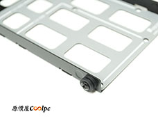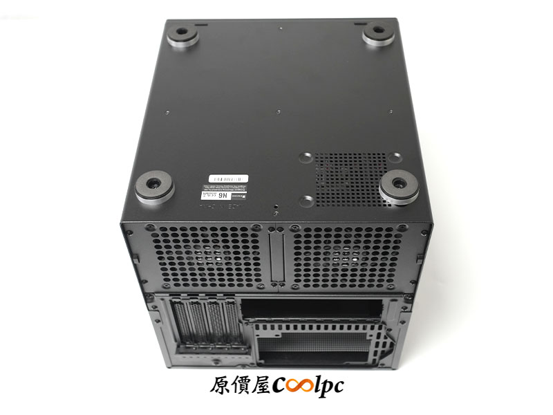機殼底部設有音響級大型腳座,並附有橡膠緩衝墊,能有效降低 9 顆高轉速硬碟運轉時產生的共振噪音。在靠近後方風扇處設有散熱開孔,主要提供給下置 SFX 電源進風使用。