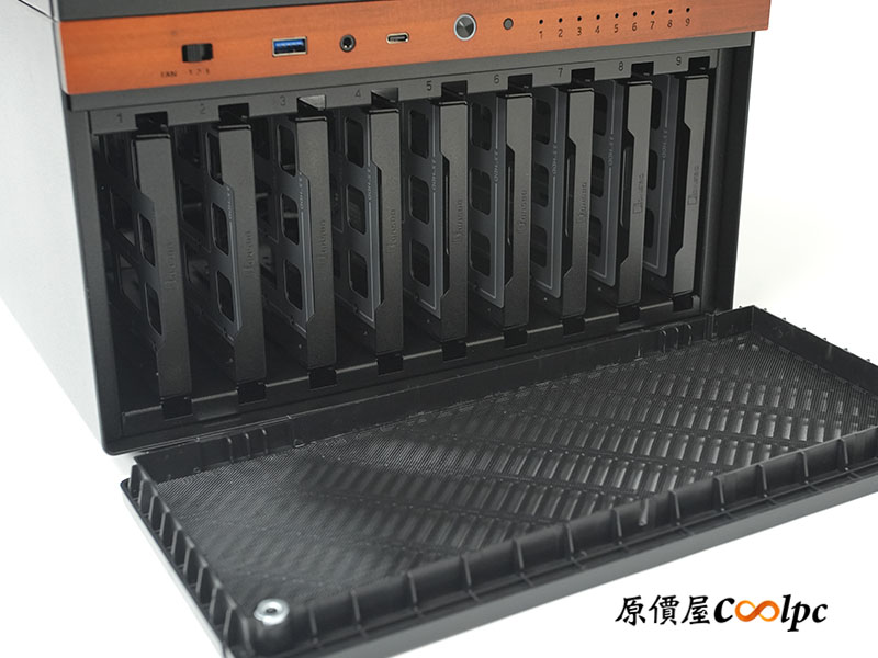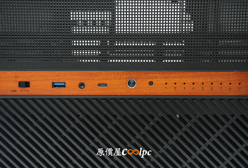 前置 I/O 整合了三段式風扇調速切換開關、主流的 USB 10Gbps Type-C、USB 5Gbps Type-A、耳麥孔、電源鍵(整合 LED)、重新開機鍵,以及 NAS 機殼專屬的 1 ~ 9 號硬碟指示燈。這個 I/O 基本上是十全十美了,唯一可惜之處…開關孔位與檔位標記稍有偏位。但身為實用派的小編,這不影響我對這咖 NAS 機殼的評價!