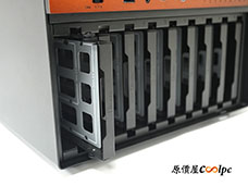 從不同角度可以看見,喬思伯 N6 機殼採用大面積散熱網孔設計,覆蓋了機身上半部的三面區域,加上前端下方的硬碟快拆面板網孔,確保內部 9 顆硬碟與 PC 零件的排熱暢通無阻。