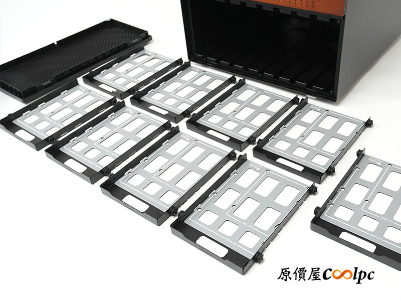 卸下面板後,內部整齊排列著 9 組硬碟托盤,各槽位都有數字標記,和 I/O 飾板上的燈號相互對應。最重要的是改用金屬托盤設計,加入符合人體工學把手更方便拆卸。托盤設計可支援 3.5″ / 2.5″ 裝置安裝 (螺絲固定),托盤內建減震橡膠圈,能有效吸收硬碟運轉時的微幅振動。有獨立金屬托盤…這也是為什麼小編比起 N3,更喜歡 N6 的主要原因。