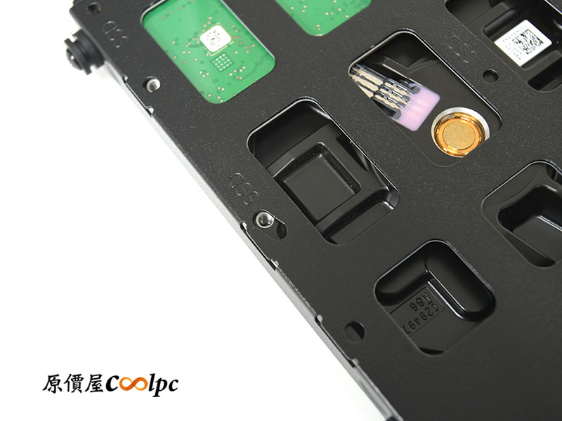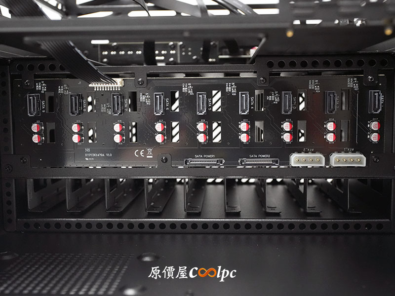 把風扇支架卸除後,可以看見 SATA PCB 板,負責 9 顆硬碟的訊號與供電整合,總共有 9 個 SATA 資料介面,以及  2 組 SATA 供電與 2 組大 4-Pin 供電介面。