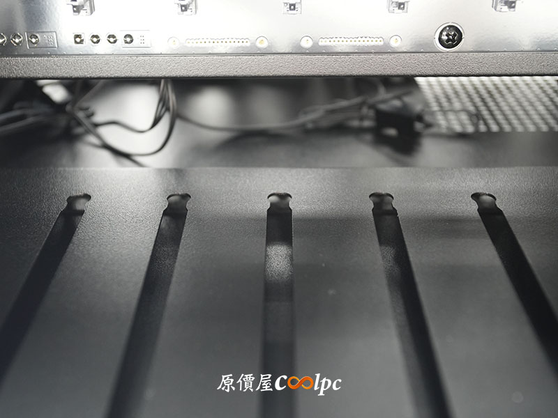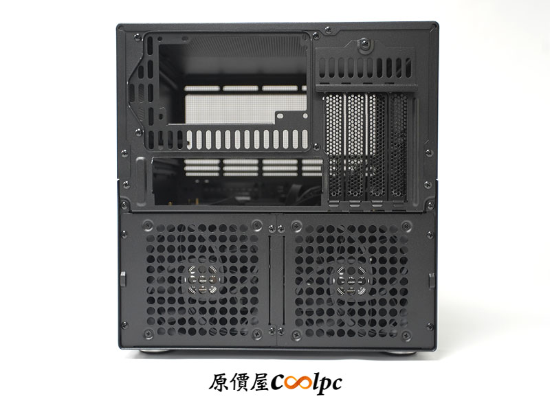 接著來看機殼後端配置,後端上方提供標準 ATX 電源安裝面板,右側則是 4 槽可重複拆卸 PCIe 擋板,不論擴充 10G 網卡、RAID 陣列卡或獨立顯卡都能自由搭配。最下方預裝兩顆 120mm 風扇,直通式散熱風道能將硬碟廢熱迅速排出。
