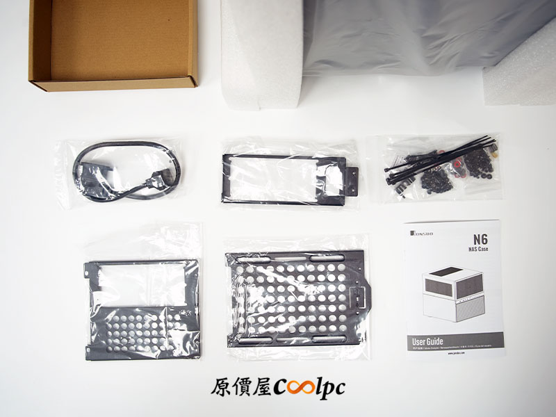 打開配件盒,內容物包含電源轉接線、後風扇轉接架、下置電源轉接架、前置電源架、說明書及螺絲包。螺絲包內有標記明確的 SSD 與 HDD 專用螺絲。其中最值得稱讚的是,針對不同電源規格(SFX/ATX),提供多種轉接支架,確保各種硬體組合都能在 N6 中自由配置。