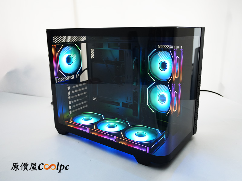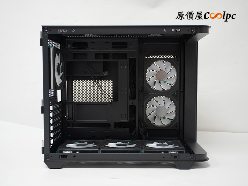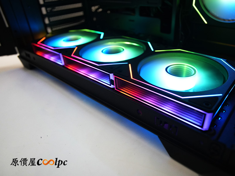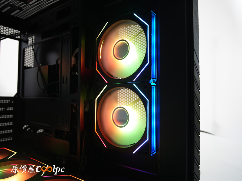主機板側與底部預先安裝五顆 120mm Infinity ARGB 反向 PWM 風扇,後方則配備一顆 120mm Infinity ARGB PWM 風扇;也就是說,只要你再補上一組 360mm 水冷就滿配啦!