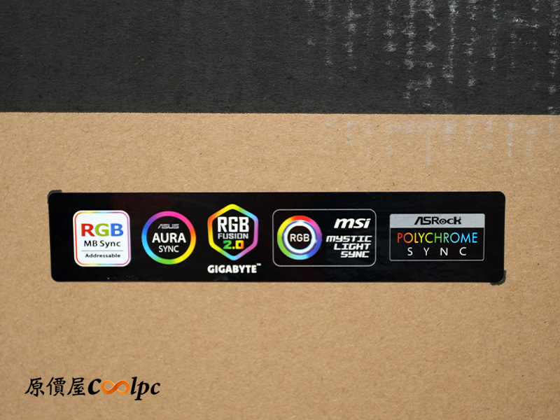 外箱採用可回收環保紙箱,印有大大的產品示意圖與型號;旁邊的貼紙特別標註支援各家主機板 ARGB 協議,想要什麼燈效隨你控,側面也貼心附上詳細的機殼規格表供參考。