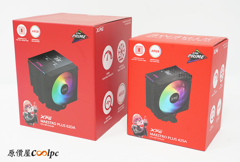 有了散熱器上的數位顯示面板,我們就可以直接透過機殼側板看到系統狀況,還不用切換視窗非常方便呢!而且現在有數位面板的空冷散熱器還是相對少見,今天要介紹給各位的XPG MAESTRO PLUS 62DA / 42SA就是稀有的存在,不僅很潮還有優異的散熱實力,當然電競必備的ARGB燈效也沒少喔。兩款散熱器外型設計差不多,基本上都是全黑化風格,分別是雙塔雙扇/單塔單扇結構,配備六根/四根熱導管,散熱TDP 250/220W。另外還有直觸底座、記憶體偏移設計,還有FDB軸承風扇帶來的卓越性能,以及在高效解熱時也能維持平均低於22dBA的噪音品質,加上在Intel LGA 185X/1700/1200/115X、AMD AM5/AM4/AM3平台都能支援的相容性,原廠再提供2年硬體保固。話不多說,趕緊將兩款散熱器都拿出來研究研究吧。