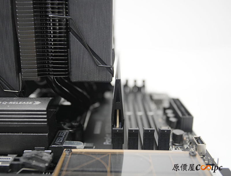 實際裝上主機板,XPG MAESTRO PLUS 62DA有偏移設計避免干涉記憶體,大致上已經閃到DIMM 1邊邊了。