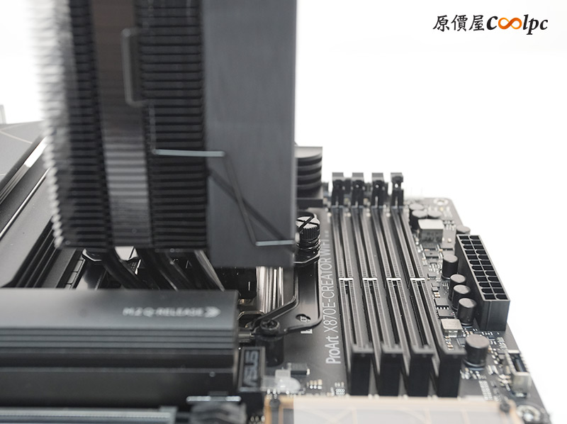 裝上主機板後,可以明顯看到偏移設計大成功,散熱器完美避開RAM插槽,如果RAM有RGB燈光也完全不會遮擋喔。