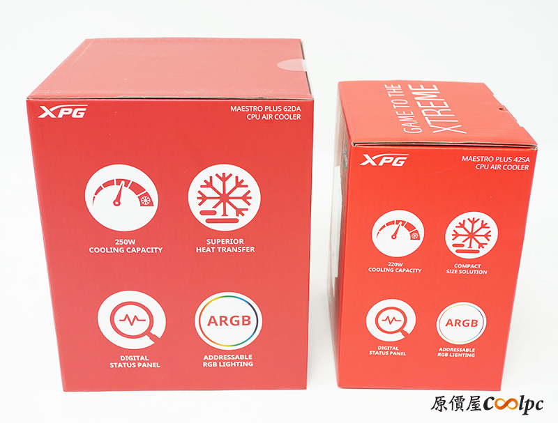 先來看一下XPG MAESTRO PLUS 62DA與42SA的主要差異,最明顯當然是62DA擁有雙塔雙扇,散熱鰭片面積與數位顯示面板都更大,還有六支直觸式熱管散熱。而42SA則是單塔單風扇,散熱面積與數位面板相對小,熱導管也減少為四支,其他地方兩者設計大致是相同的。