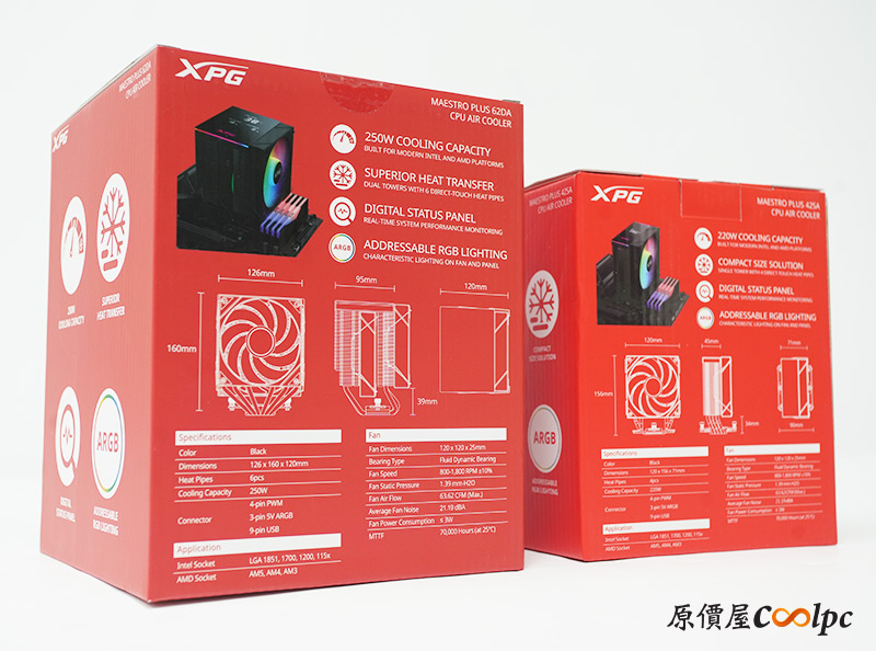有了散熱器上的數位顯示面板,我們就可以直接透過機殼側板看到系統狀況,還不用切換視窗非常方便呢!而且現在有數位面板的空冷散熱器還是相對少見,今天要介紹給各位的XPG MAESTRO PLUS 62DA / 42SA就是稀有的存在,不僅很潮還有優異的散熱實力,當然電競必備的ARGB燈效也沒少喔。兩款散熱器外型設計差不多,基本上都是全黑化風格,分別是雙塔雙扇/單塔單扇結構,配備六根/四根熱導管,散熱TDP 250/220W。另外還有直觸底座、記憶體偏移設計,還有FDB軸承風扇帶來的卓越性能,以及在高效解熱時也能維持平均低於22dBA的噪音品質,加上在Intel LGA 185X/1700/1200/115X、AMD AM5/AM4/AM3平台都能支援的相容性,原廠再提供2年硬體保固。話不多說,趕緊將兩款散熱器都拿出來研究研究吧。
