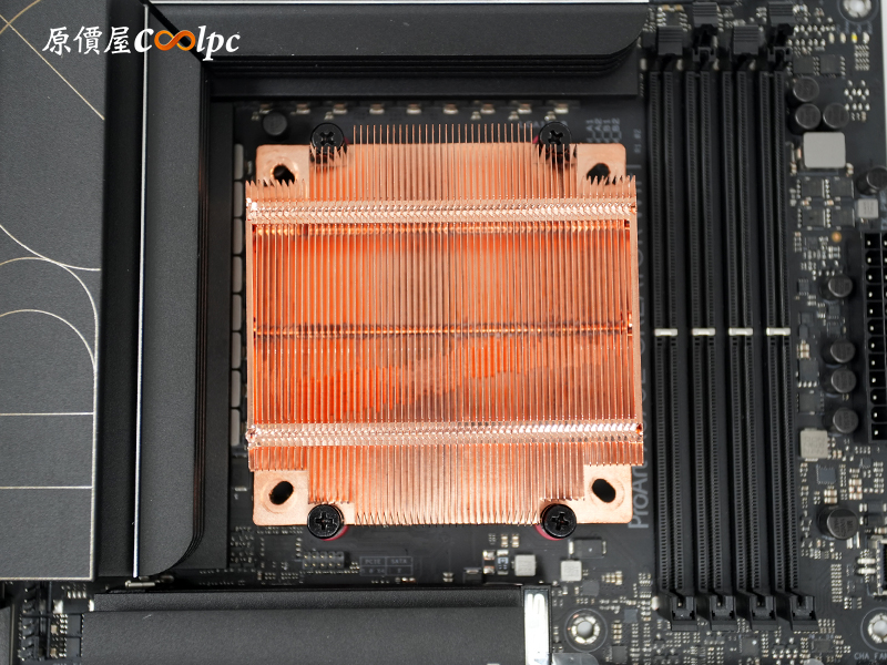 接下來看實際安裝的效果。可以看到散熱器本體相當精巧,僅涵蓋在 CPU 區域周圍,與旁邊的 MOS 散熱鎧甲及 M.2 散熱片之間都保有相當充裕的距離,完全不會產生干涉。