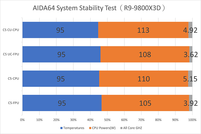 既然官網標榜支援 AMD 9800X3D,我們就直接實測這顆 CPU。在 BIOS 維持預設值的狀況下,使用 AIDA64 進行 10 分鐘壓力測試。結果顯示兩款散熱器最終都壓在 95 度的溫度牆邊緣,全程沒有出現過熱降頻的情況,可見這塊 VC 均熱板在有限空間下的解熱效率確實強悍。
